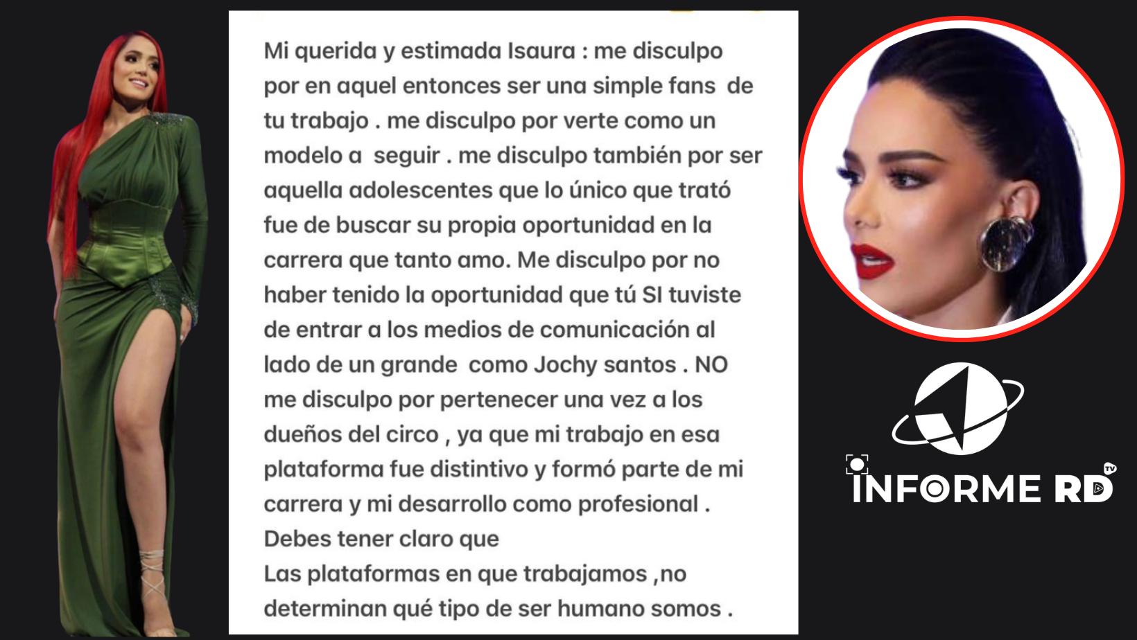 Por su parte, Yapoort replicó las explicaciones de Taveras con una historia de Instagram en la que de manera sarcástica le pidió disculpas por «en aquel entonces ser una simple fan de tu trabajo», «por verte como un modelo a seguir» y «por no haber tenido la oportunidad que tú sí tuviste de entrar a los medios de comunicación al lado de un grande como Jochy Santos».
